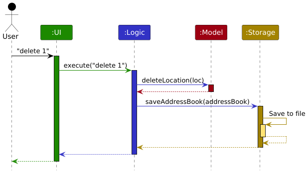 The Sequence Diagram below shows how the components interact with each other for the scenario where the user issues the command delete 1.