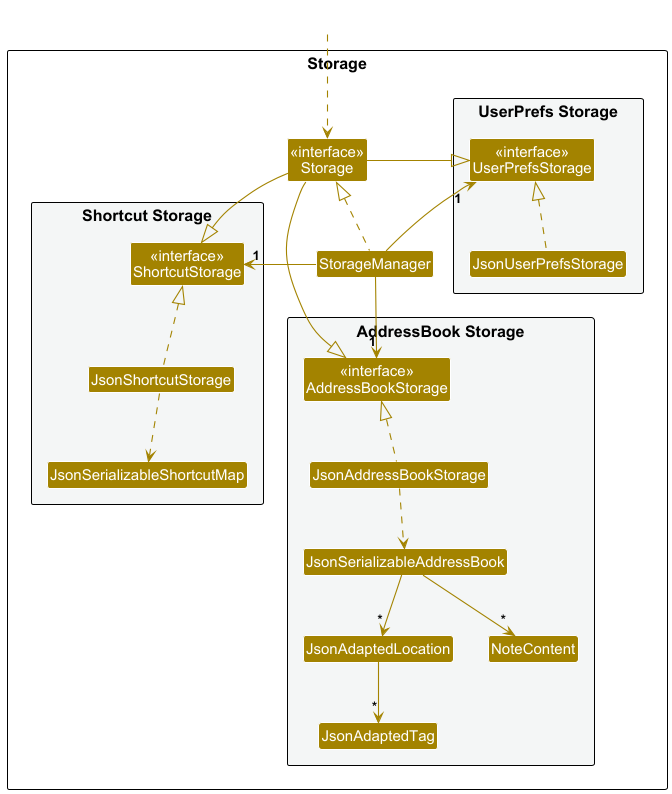 Storageinterface, which extendsAddressBookStorage,UserPrefsStorage, andShortcutStorage, so clients can depend on either the unified API or a narrower storage interface when needed. - is implemented by