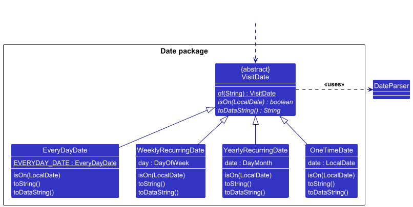 VisitDates in AddressMe have many different behaviours, possibly being recurring, or one-time. It is implemented using polymorphism, where the subclasses support the few abstract methods required to function. The VisitDate class is also implemented as a factory, taking in Strings to return a VisitDate of its appropriate subclasses.